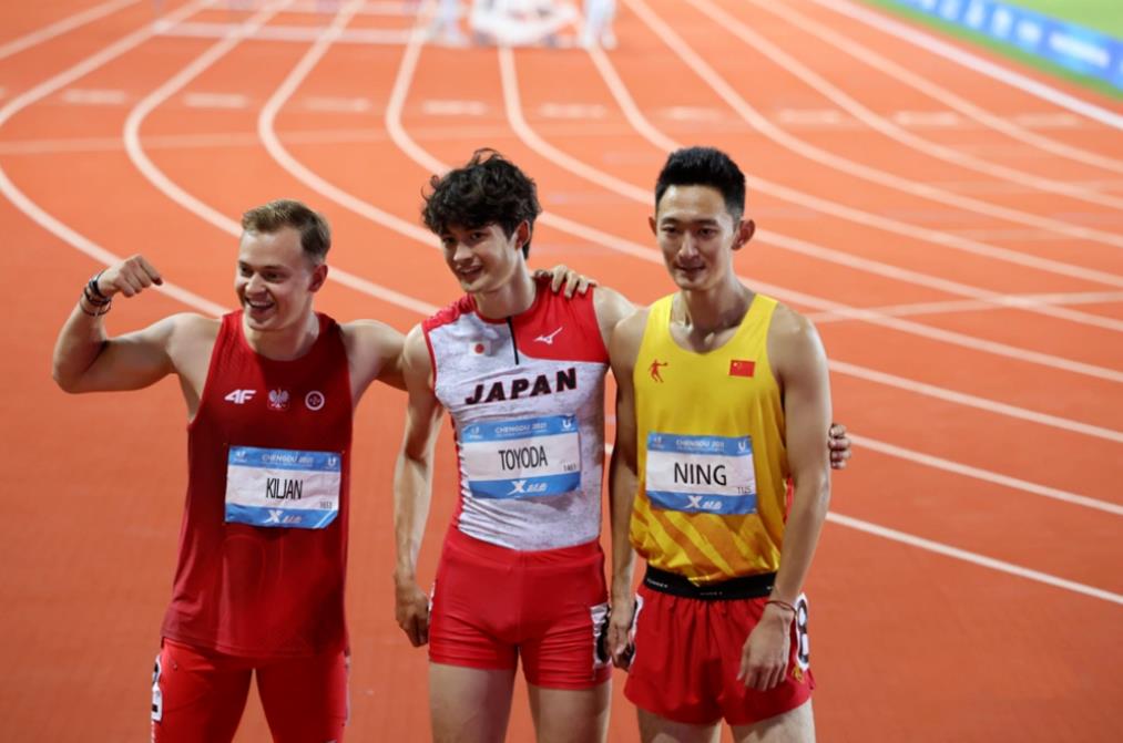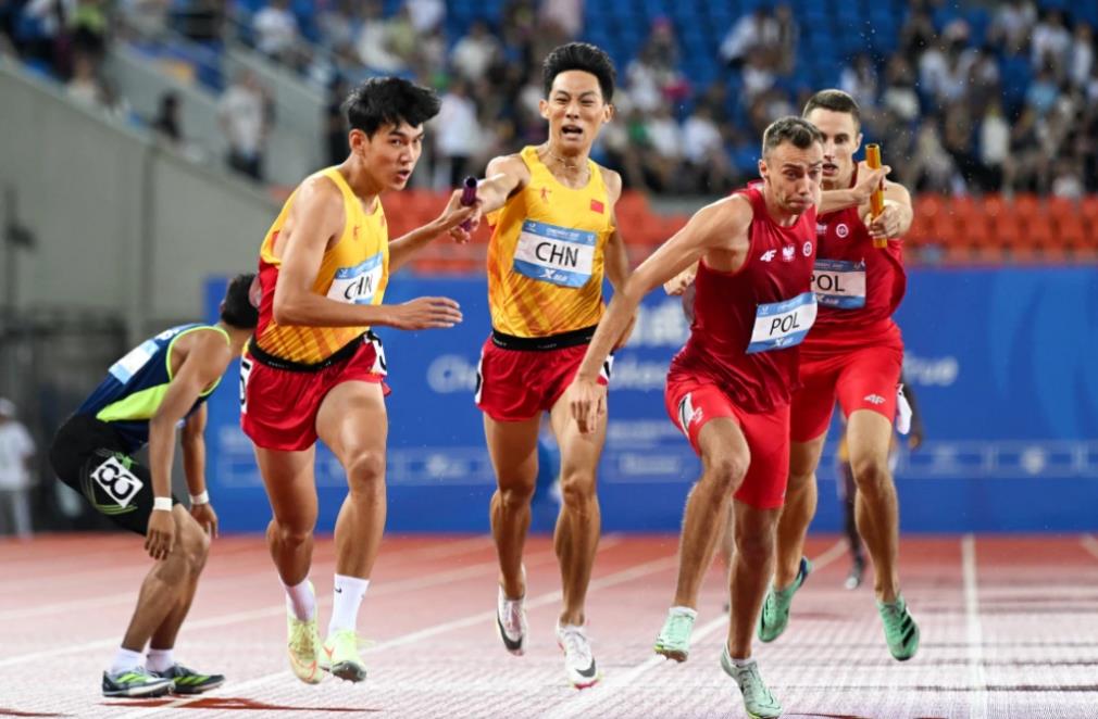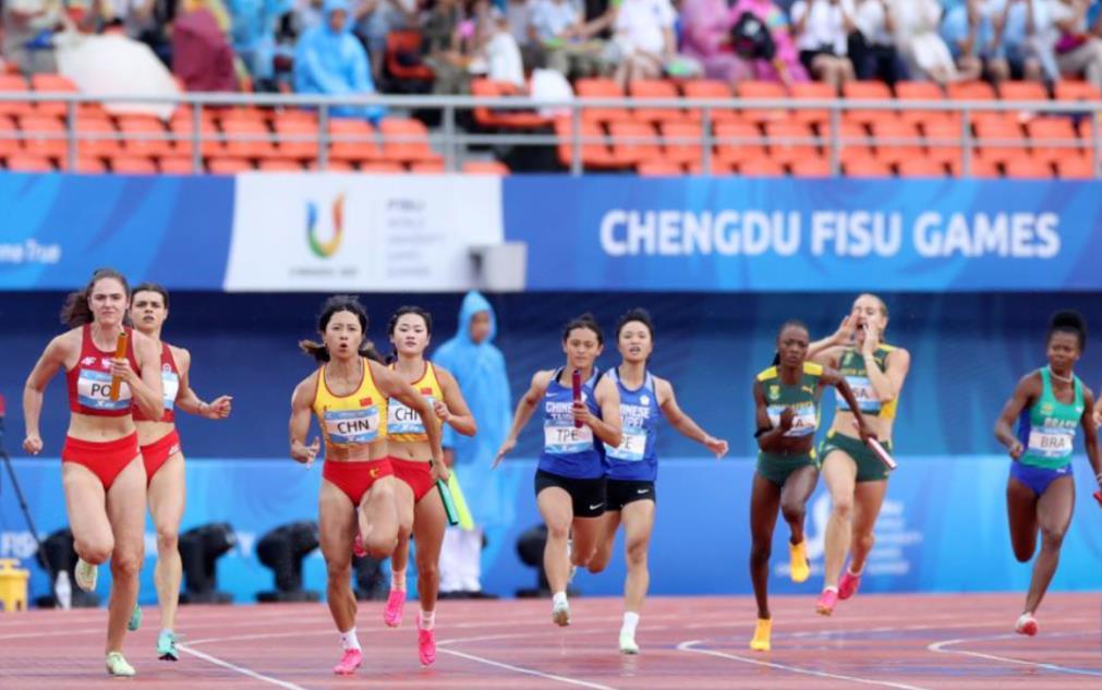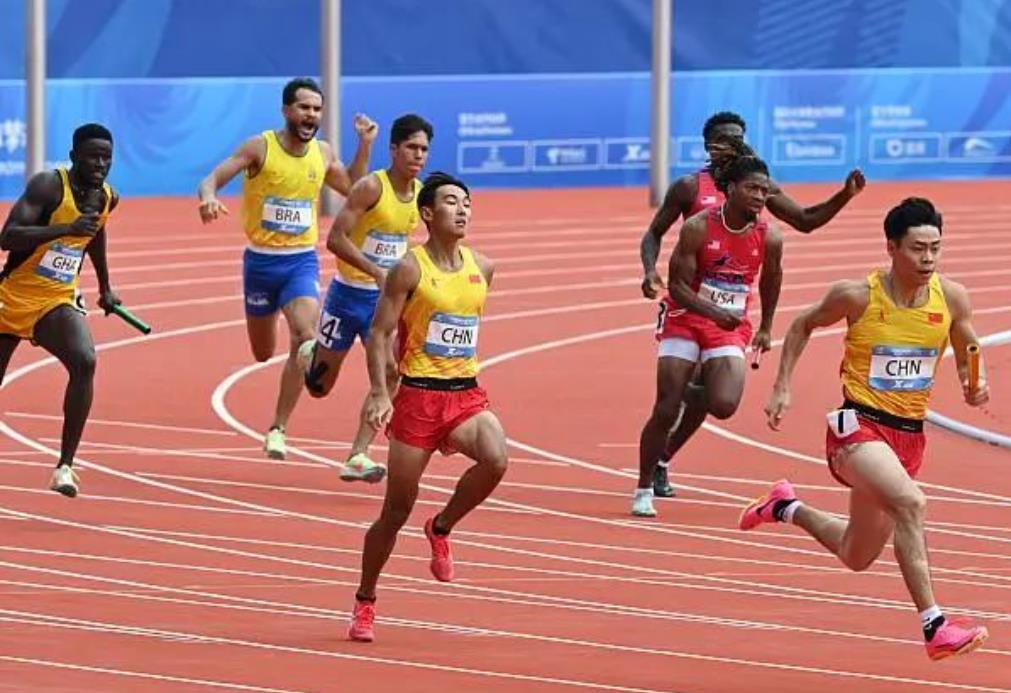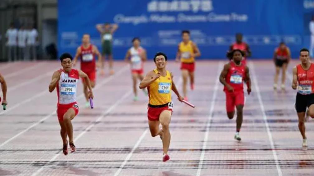 成都大運(yùn)會(huì)男子4*100米接力決賽,中國(guó)隊(duì)陳佳鵬、陳冠鋒、嚴(yán)海濱、鄧智艦位于第四道。以38秒80的成績(jī)壓線(xiàn)絕殺獲得冠軍!這也是陳冠鋒和隊(duì)友們的第一個(gè)世界級(jí)賽事冠軍。